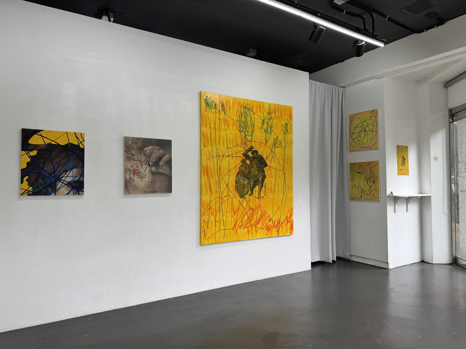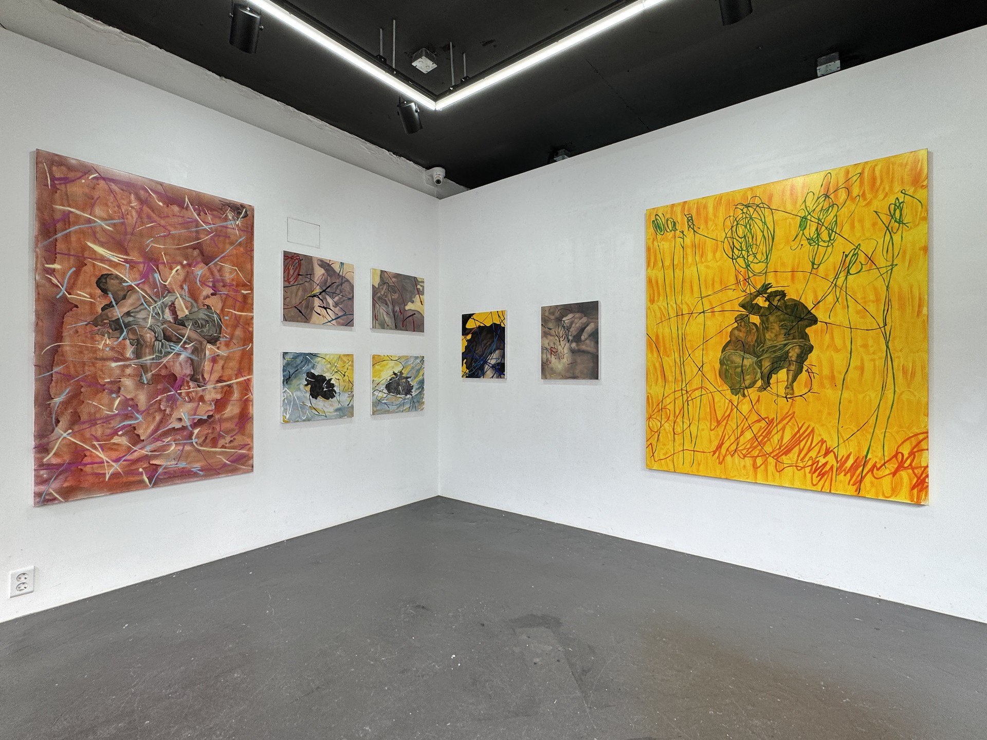 이번 전시에서 김평진은 본인이 상속받은 이미지 위에 아들 이도의 드로잉을 병치시킨다. 〈천지창조부터 이도를 안고 있는 엄마까지〉(2025), 〈선지자 요나부터 이도까지〉(2025)의 작업은 고전 회화를 모노톤으로 재현했던 이전 작업과 확연히 다르다. 과거와 지금의 시간이 공존하는 화면을 나타내기 위해, 유화로 레이어를 올려 배경을 정돈한 뒤 그 위로 거칠고 과감한 선을 단숨에 그었다. 단면적인 선이 역사적인 도상을 덮는다. 이도가 불쑥 나타난 김평진의 작업은 상속받은 이미지와 새로운 이미지, 시간과 재료를 함께 쌓아 재현한 도상과 빠르게 그어진 선이 교차하며 시간성을 가시화한다.