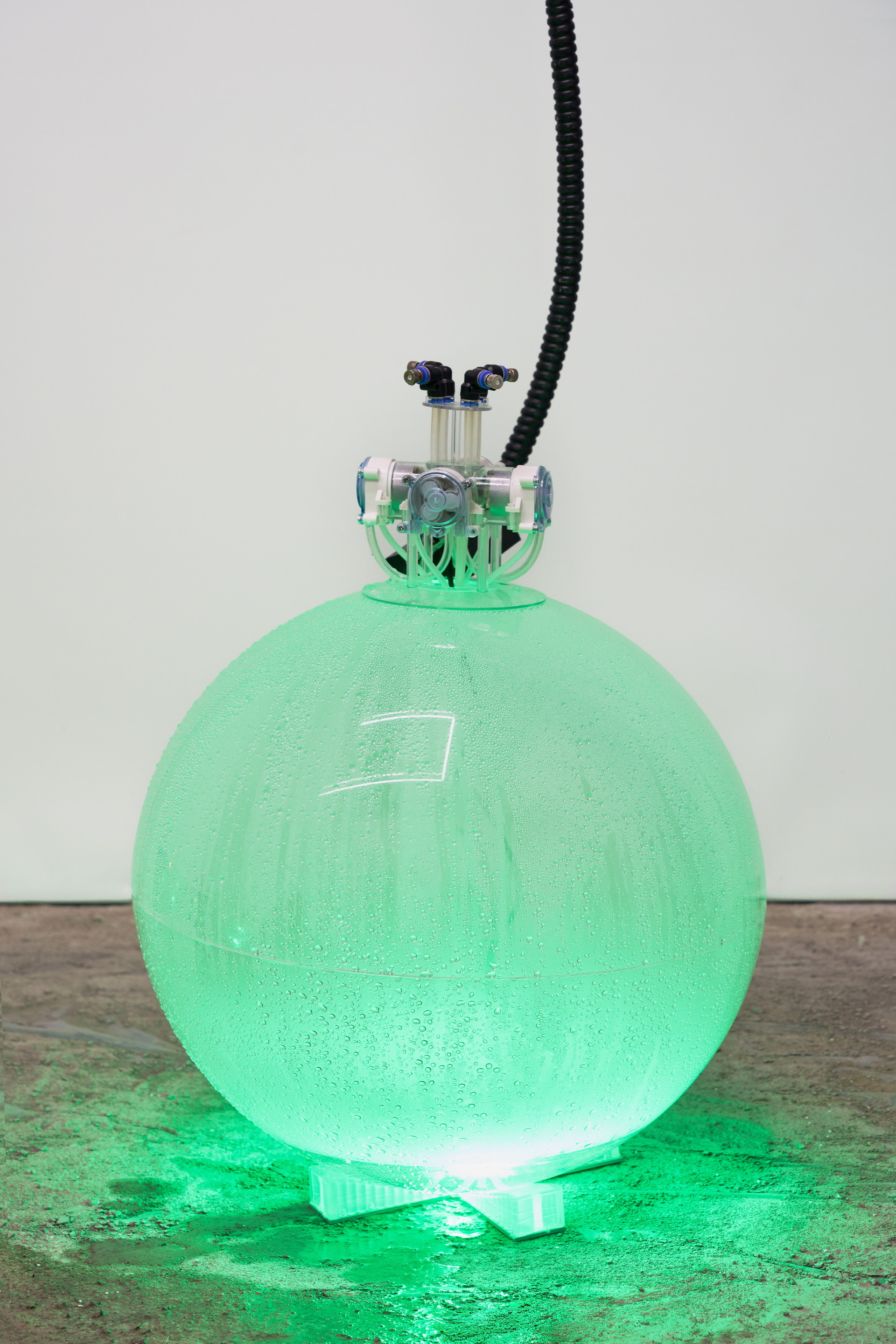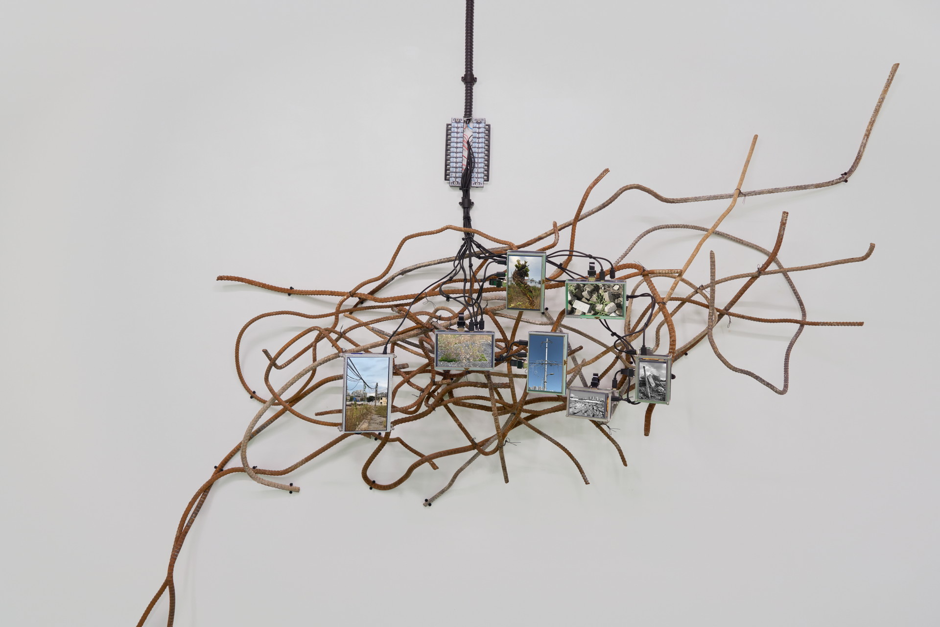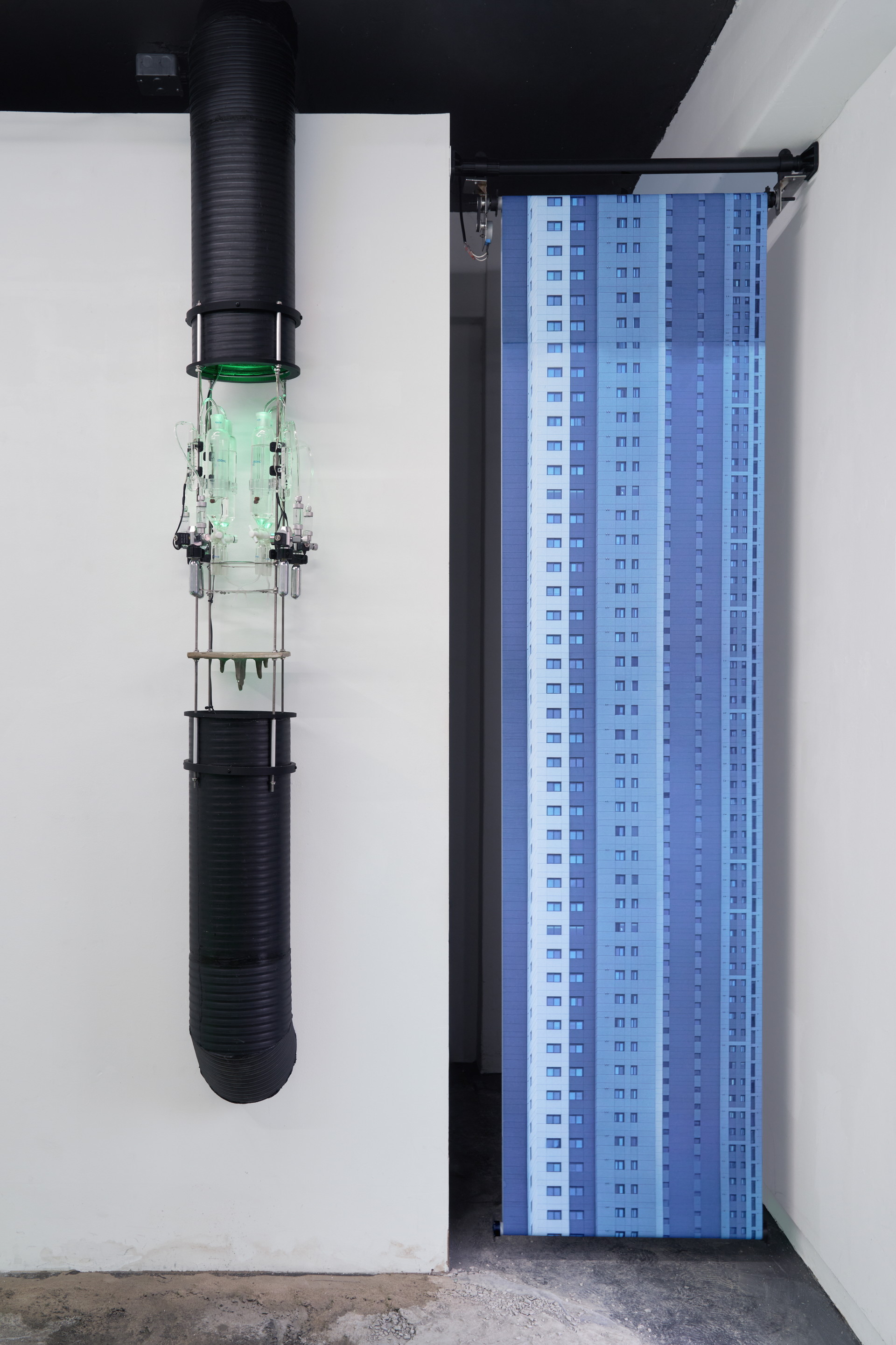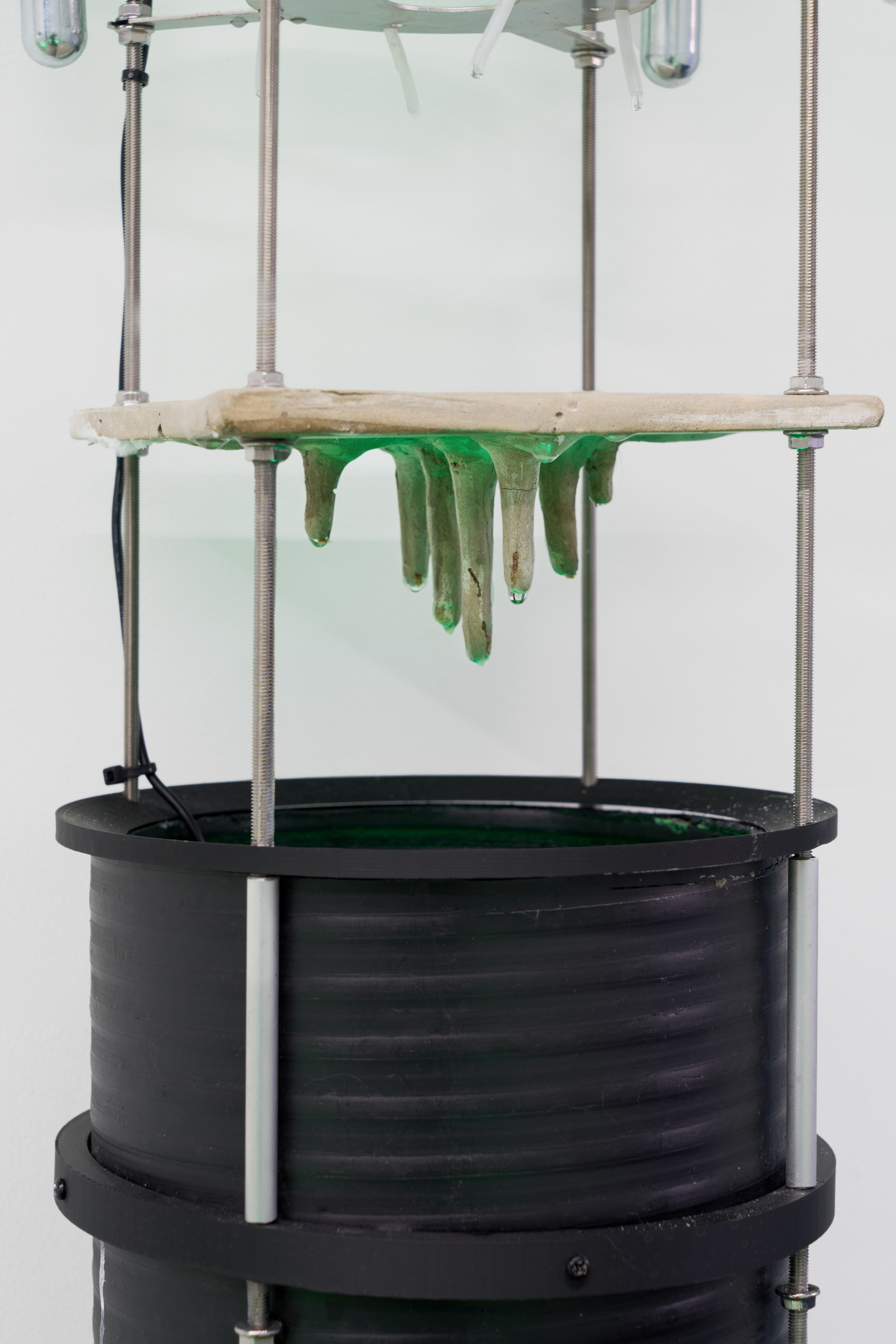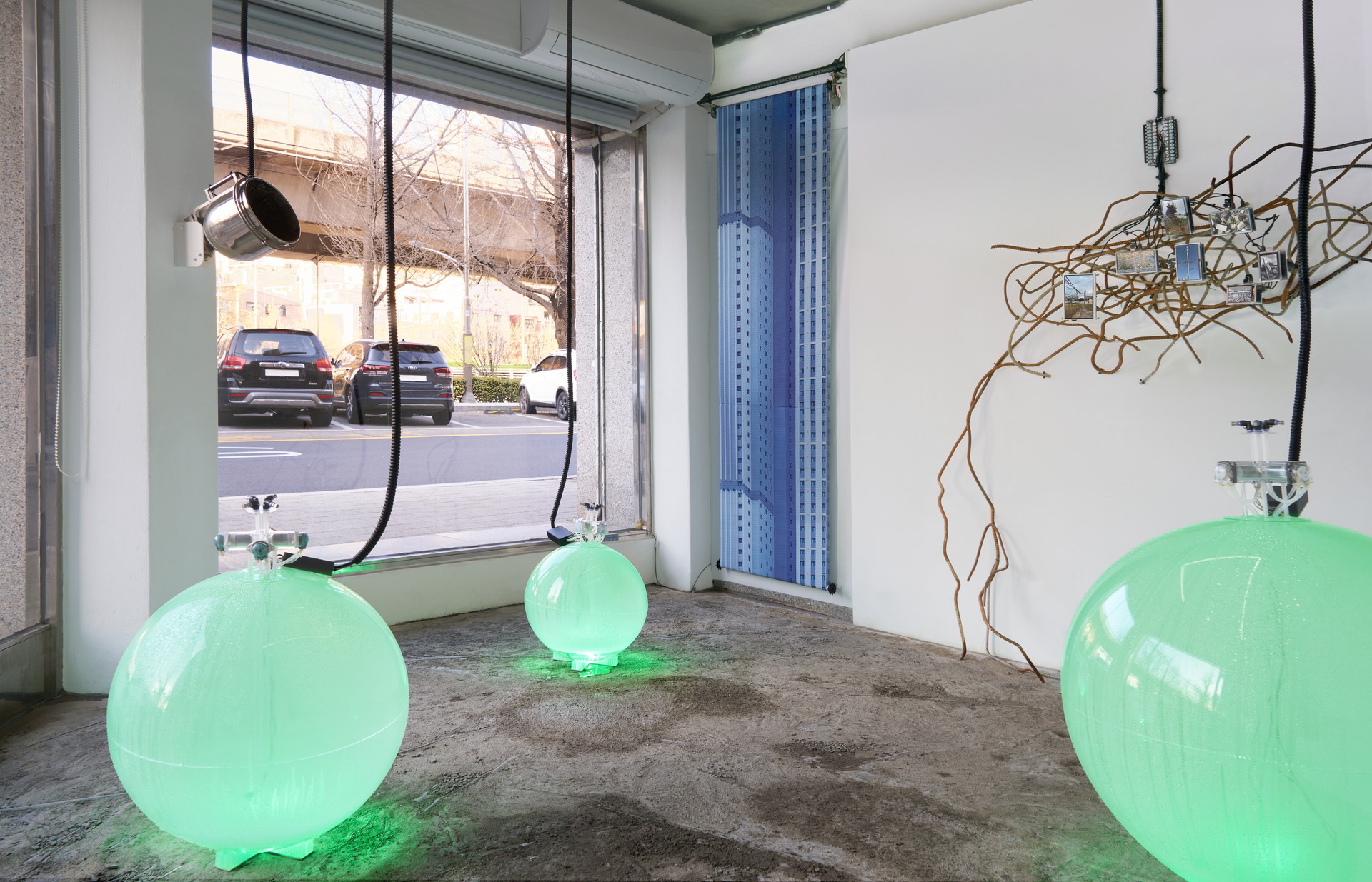 작가는 콘크리트의 균열 가능성을 극대화하며 실패하는 콘크리트들을 미학관에 디오라마처럼 펼쳐 놓았다. 도포되어 있는 시멘트는 시간에 맞춰 분사되는 물방울과 닿을 때 얇은 콘크리트 막을 형성하게 된다. 약한 강도로 굳은 콘크리트 막은 관람객의 무게를 견디지 못해 부서지고, 물에 의해 다시 응결하는 과정을 반복하는 〈유사-콘크리트 공법〉은 생략되고 간소화된 공정에서 드러나는 콘크리트의 연약함을 보여준다. 〈지연 궤도〉는 마천루의 등장으로 콘크리트가 많이 필요하게 되자 제작 시간과 인력을 아끼기 위해 고안된 미리 섞은 콘크리트(ready mixed concrete), 레미콘의 존재 방식을 보여준다. 경화되지 않도록 돌아가는 회전 드럼과 그 안에서 준비된 상태로 머무는 레미콘의 모습은 효율성에 의해 조작되고 지연되는 시간을 드러낸다. 〈종유석 연성 장치〉는 콘크리트 내부 칼슘이 녹아 생성되는 도심형 종유석(Calthemite)을 재현한 작업이다. 자연과 인간, 자본주의가 결합되면서 생성되는 새로운 지질 환경을 보여준다. 〈광물화된 표본들〉은 생명이 다한 콘크리트가 제거하고, 새로운 콘크리트를 올리려고 하는 재개발구역에서 채취한 풍경이자 도시표본이다. 재개발이 한동안 멈췄던 사이 그 틈새로 자리잡은 비인간 존재들은 공사가 재개되자 빠른 속도로 사라질 운명에 처한다. 작가는 도시 곳곳에서 끊임없이 반복되는 흙-콘크리트-비인간 존재들-콘크리트의 순환 과정의 단면을 우리에게 보여준다. 콘크리트와 흙만 남은 현장과 사라졌지만 데이터로 남은 비인간 존재들.